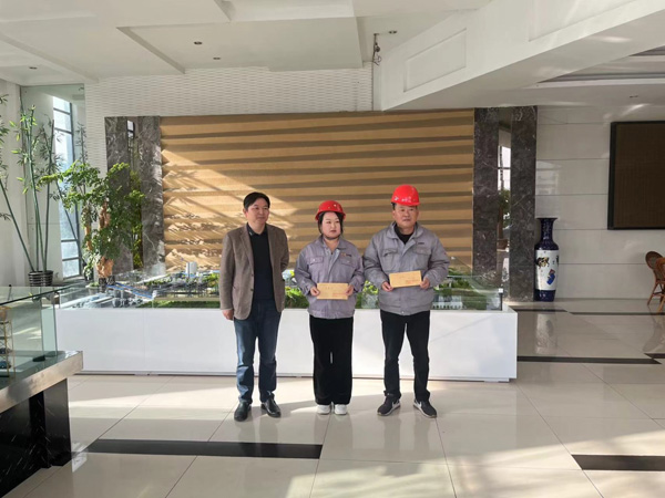2023年11月15日下午3時,公司總經(jīng)理張啟明向受到表彰的周陵元、賀慧玲給予現(xiàn)金獎勵,并與他們合影留念。